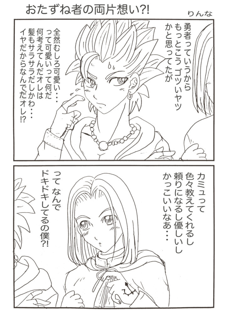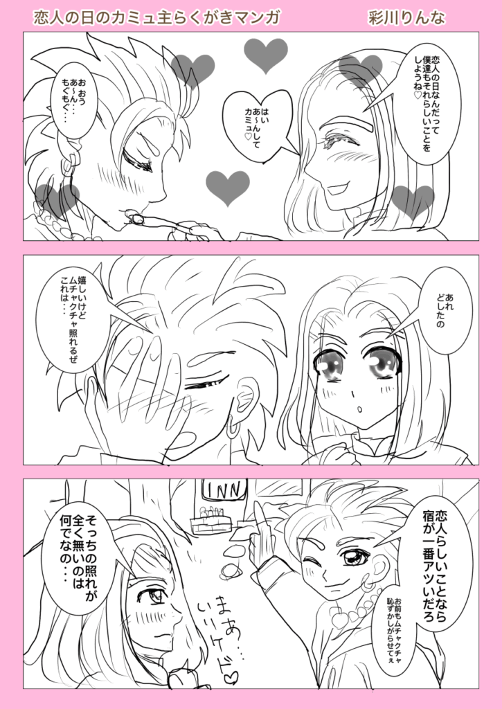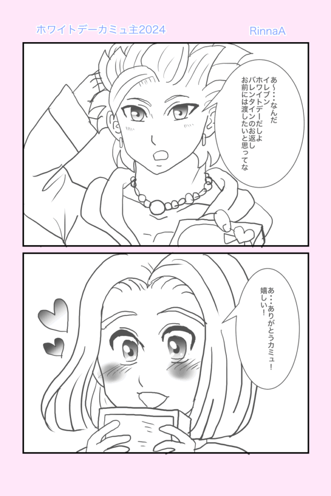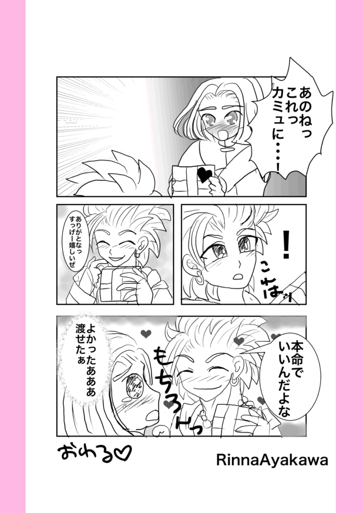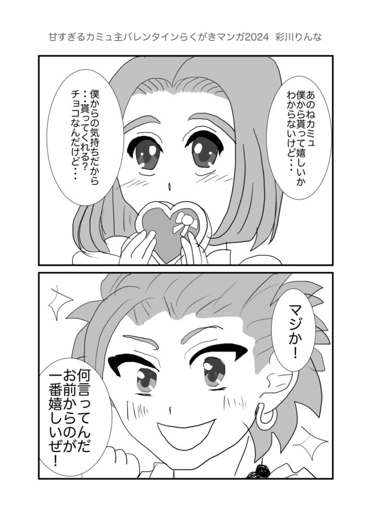カミュ主のマンガ02 2025.12.01 カミュ 新作じゃ、ねーんだけどよ、りんなが前回載せ忘れたマンガ載せてるらしいぜ、オレと相棒との・・・何だ・・・マンガだ ホントに渡してるだけですが、こういうの渡すだけで普段よりどっきどき!かな? 2025/2 お互いがお互いの光なんですよねっ! 2024/9/21 宿でのひとコマ。お酒が入るとこうなるのか?!マンガじゃないけどここに。 2024/7/2 照れ方が、おかしい気がしますが、恋人の日カミュ主でした! 2024/6/12 なんだか、うちのカミュ主はすぐ、おたのしみでしたね状態になりますね(笑)ホワイトデー2024でした! 2024/3/13 ホントに乙女化するイレブン君ですが、幸せになれ!バレンタイン2024カミュ主でした。 2024/2/14 お互い思う、好意?!両片思いの焦れったいヤツ 2022/12/9