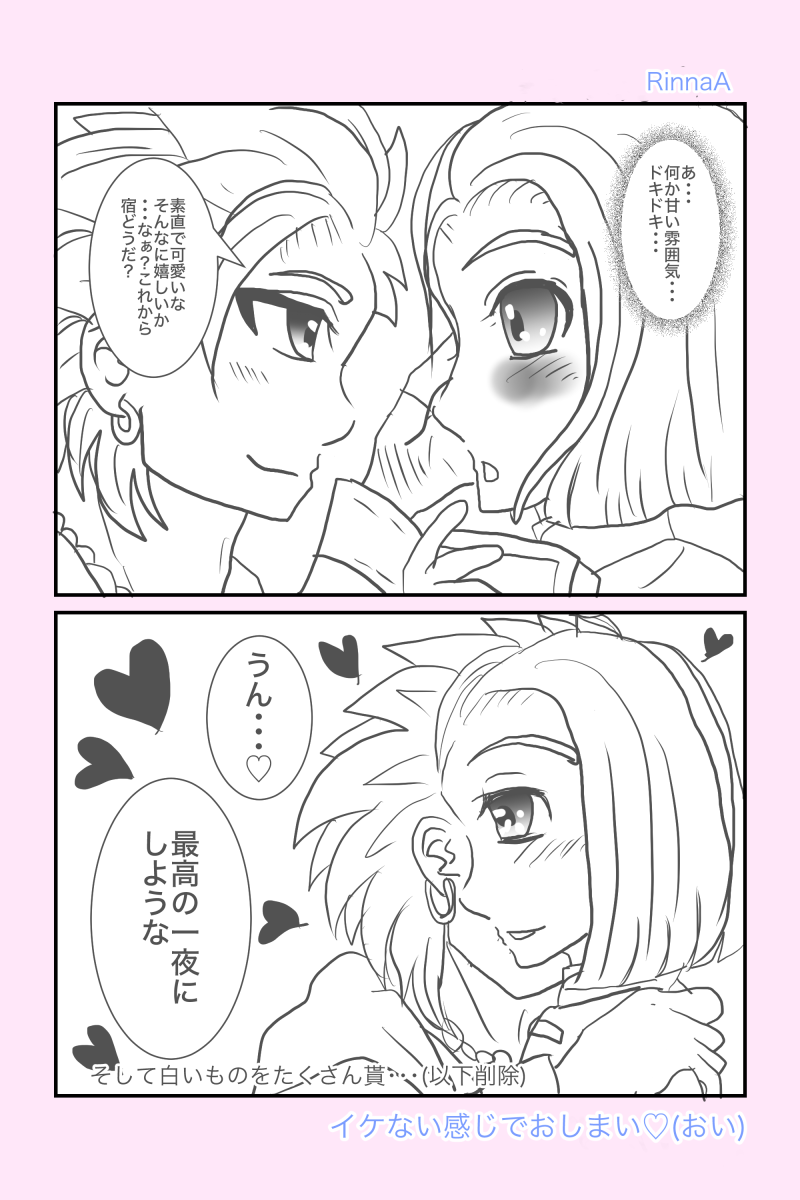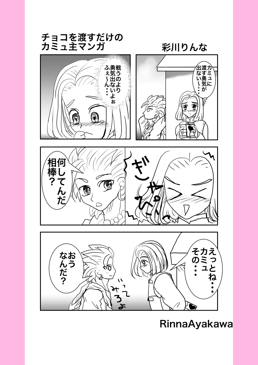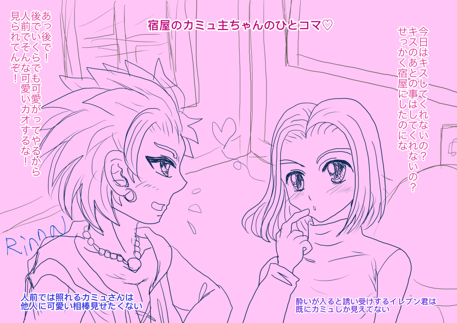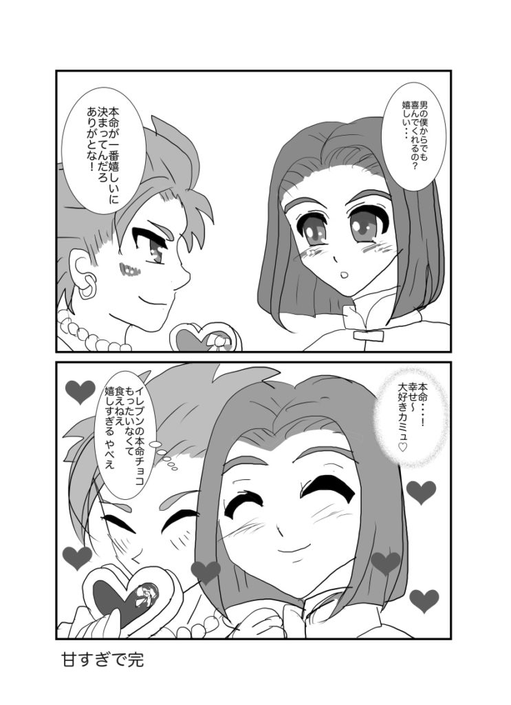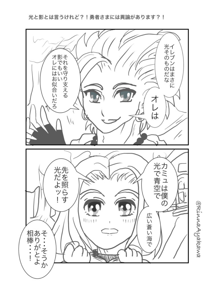 カミュ主のマンガ02 2025.12.01 カミュ 新作じゃ、ねーんだけどよ、りんなが前回載せ忘れたマンガ載せてるらしいぜ、オレと相棒との・・・何だ・・・マンガだ ホントに渡してるだけですが、こういうの渡すだけで普段よりどっきどき!かな? 2025/2 お互いがお互いの光なんですよねっ! 2024/9/21 宿でのひとコマ。お酒が入るとこうなるのか?!マンガじゃないけどここに。 2024/7/2 照れ方が、おかしい気がしますが、恋人の日カミュ主でした! 2024/6/12 なんだか、うちのカミュ主はすぐ、おたのしみでしたね状態になりますね(笑)ホワイトデー2024でした! 2024/3/13 ホントに乙女化するイレブン君ですが、幸せになれ!バレンタイン2024カミュ主でした。 2024/2/14 お互い思う、好意?!両片思いの焦れったいヤツ 2022/12/9